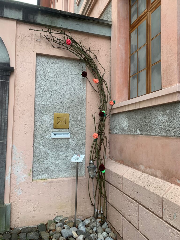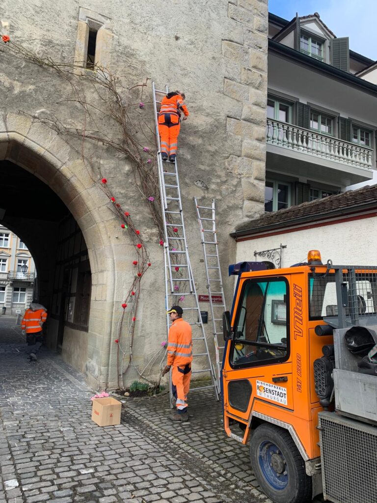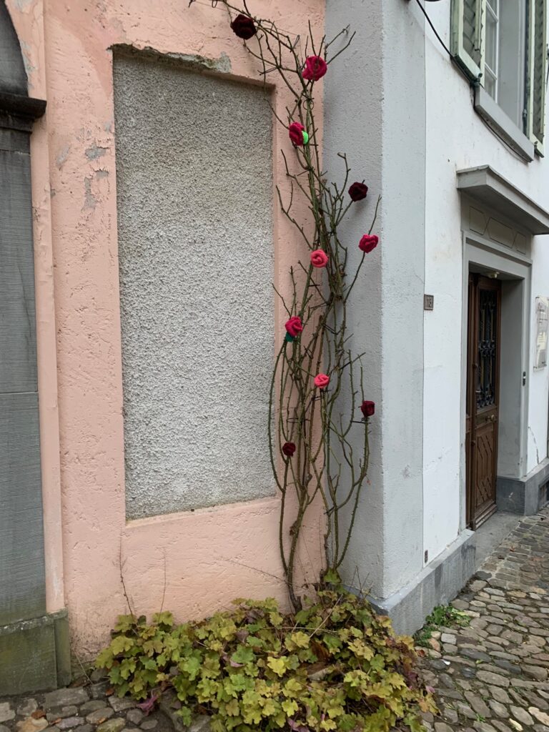 Wunderschön sind sie anzuschauen die blühenden Rosen an den Rosenbogen beim Rathaus, beim zu Turm und vor dem Museum. Doch halt, Rosen jetzt im Winter? Fleissige Strickerinnen des Gemeinnützigen Frauenverein unter der Anleitung von Margrit Gabban haben gewirkt um der Bevölkerung von Bischofszell eine Freude zu bereiten. Der Turm ist aber hoch und bis jetzt konnte er noch nicht vollständig zum Blühen gebracht werden.